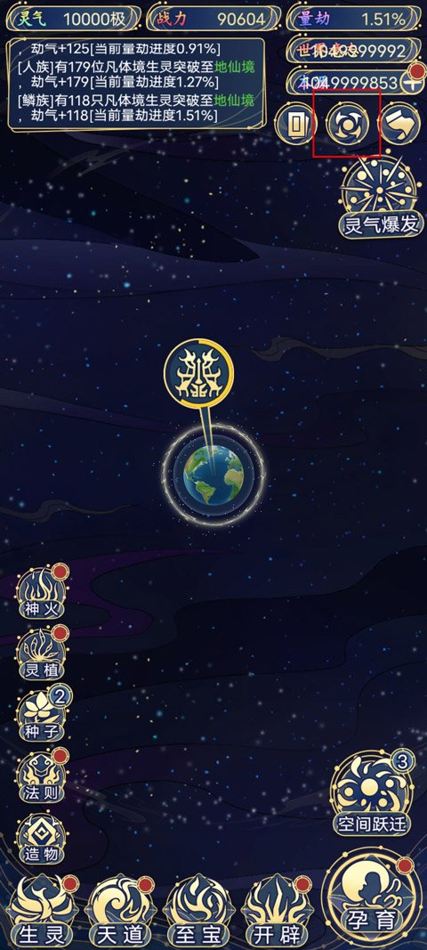 2、进入游戏如图,游戏主要包含法则、造物、生灵、天道、至宝、开辟、孕育以及空间跃迁玩法。