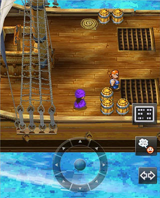 走出房间我们发现,原来我们是在一艘船上,这里需要我们调整一下视角才可以看到船帆后面的木桶,经常玩RPG游戏的玩家应该都和小编一样有个习惯,那就是每到一个场景都要把各个地方都搜刮一遍,玩勇者斗恶龙5也不例外。在开始的房间和甲板上我们先把柜子、图书架以及这些木桶全都搜查一遍,可以获得一些道具和物品。
