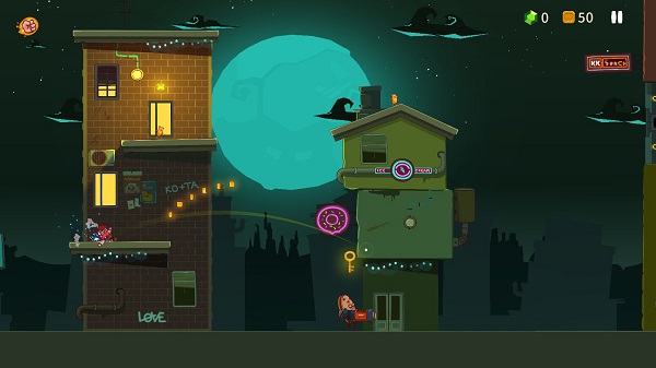 基本上玩家仅凭一根手指头就能操纵,这里没有上下左右的方向键,也没有跳跃键,拖动主角会出现抛物线,之后您会进入“子弹时间”,周围动态会变得很慢很慢,松开手,主角就会按照抛物线的轨迹弹射出去,而且可以粘在任何地方。