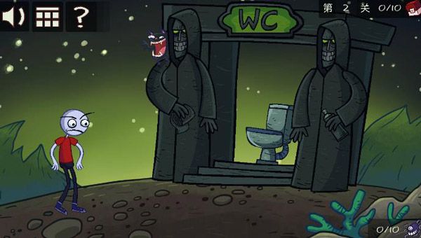 2、第二关:首先点击右侧的恶魔使用喷雾一次解锁中间的气体,再点击厕所坐上去。