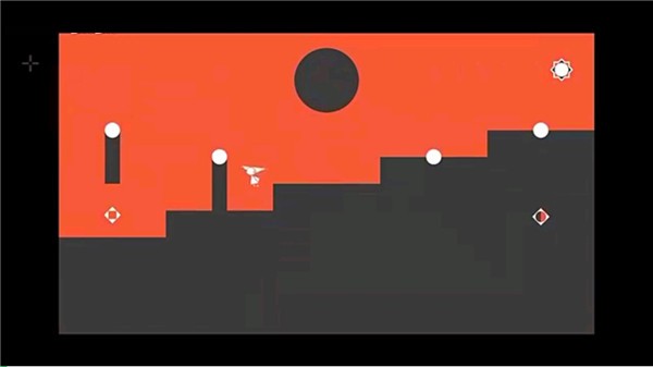 6、第六关,先向右跳跃,中间三个台阶是动态的,注意跳跃间距,激活下方白圈,等待场景变化后跳回中间再向右上跳跃即可。