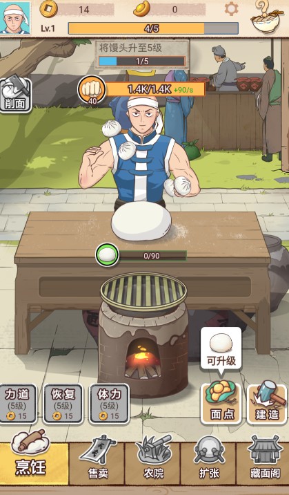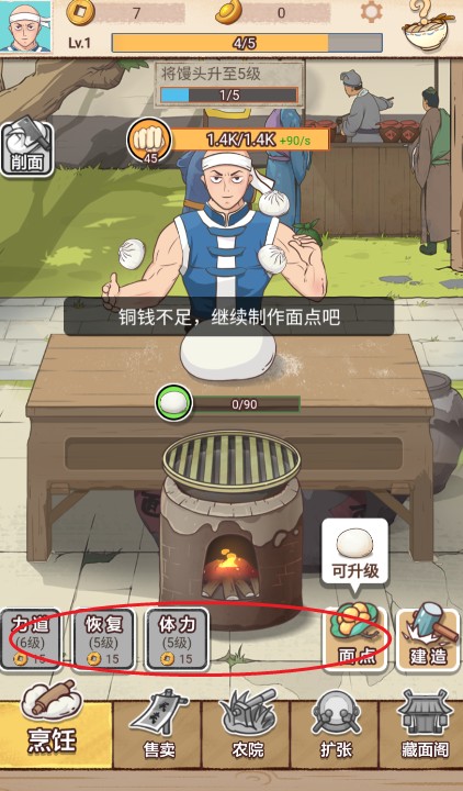 2、不断点击空白处制作面食,开始蒸面食售卖赚钱。