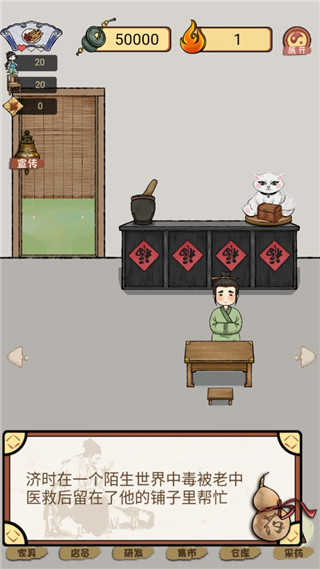 2、进入游戏后,玩家在一个陌生世界中毒被老中医救后留在了它的铺子里帮忙;