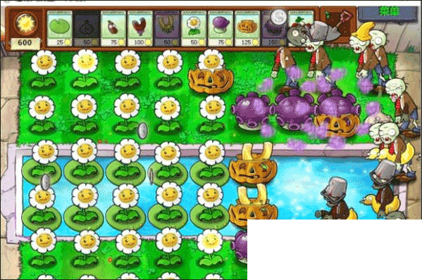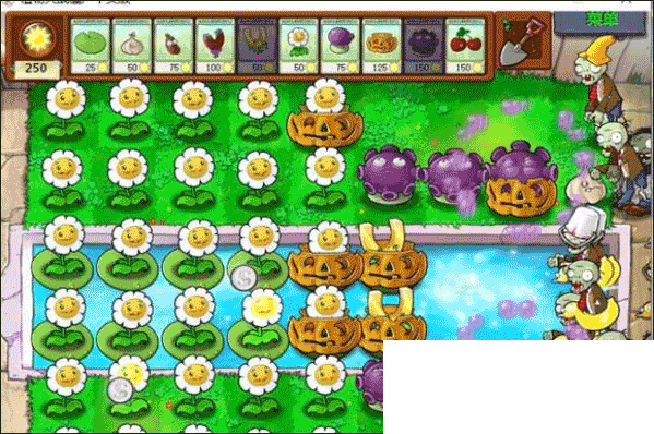 3、过了第2波后,可以使用剩余的阳光换上新的蒜头,把烂的南瓜头换新的。
