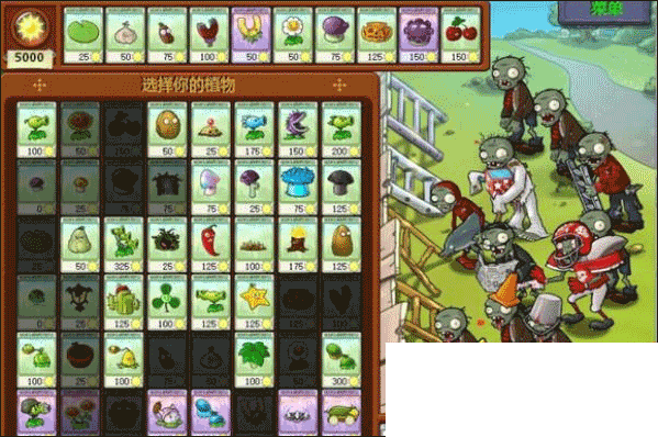 1、为了更快赚到金币,大家可以选择《谁笑到最后》这个模式,该模式的设定为:开局拥有5000阳光,且每过一波后获得250阳光、可以提前摆阵,植物无冷却,这样可以使阵容快速成型了,但不能选择向日葵、阳光蘑菇和免费的2种蘑菇。僵尸防御高的有铁桶、橄榄、铁珊门。大家可以按照小编下图植物选择,为了赚金币,缺一不可。