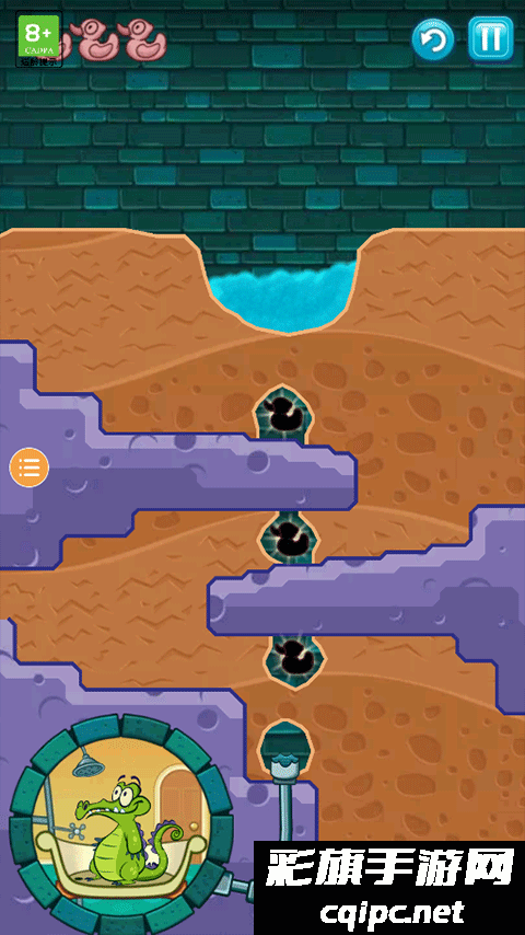 5、让水成功流到小鳄鱼位置,让小鳄鱼成功洗上一个舒服的澡即可通过关卡;