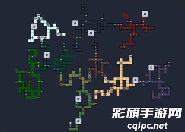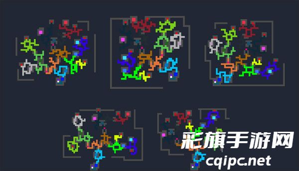 游戏每次开始都会重新生成一种整体构造的大地图,大多数格子会是野外,野外可以打怪,获得素材,积累金币,玩家可以自由的在这里穿梭,不同颜色代表了不同的生物群落,比如白色是雪山,绿色是丛林,黑色是洞穴。