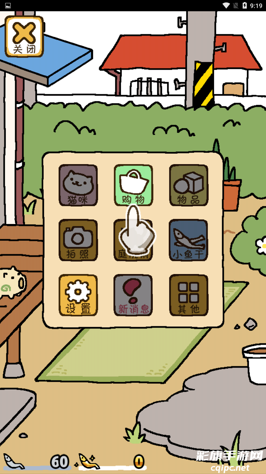 4、包括猫咪、购物、物品、拍照、小鱼干、设置等选项,点击【购物】选项,