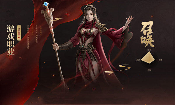 召唤以棍为武器,具有“灵活进退重牵制”的职业特点,后期有亡灵系、天神系、自然系三大进阶转职方向。