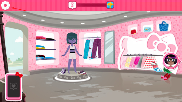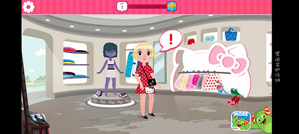 2、玩家将来到凯蒂猫的服装店铺,点击“!”接待第一位顾客。