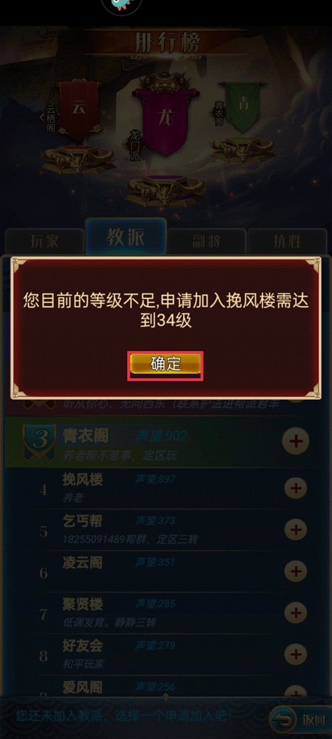 3、如果有一点需要注意的是,需要你的等级达到34级的时候,才能有申请加入教派的权限。