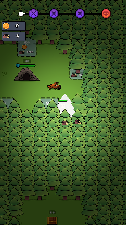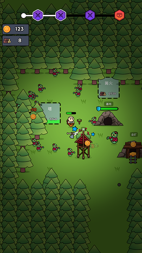 全军冲锋小游戏结合了生存冒险、战略塔防和游荡元素,玩家需要在森林中砍伐树木以获取木材,并建造篝火、箭塔和金矿等设施,以应对来自四面八方的僵尸攻击,通过升级,你可以获得随机增益,通过合理组合buff,可以增强移动速度和资源获取等属性,保持更多的波,这款游戏有丰富的策略。如何设置陷阱,安排防线,把握防守机会,都将决定你防守的成败。