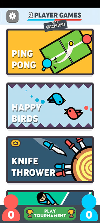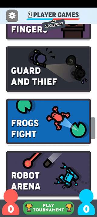 一、新手入门1、在本站下载安装好两个人的游戏挑战正版后,打开进入,上下滑动选择游戏。2、以乒乓球游戏为例,人机模式和智能机器人对战,双人模式可以和好友进行游戏。3、选择双人模式后直接可以玩,选择人机模式可以滑动选择游戏难度,再开始游戏。4、根据游戏规则用你的手指移动球拍并旋转球,累计7分获胜,右侧可以退出。5、滑动还有更多其他小游戏可以体验!二、规则介绍1、乒乓球用你的手指移动球拍并旋转球,赢取7分获胜!2、快乐河马轻触可吃球并得分+你的颜色得2分,吃了对手的颜色得-1分。先得50分获胜!3、拉绳子尽可能快地敲击,用力拉!把旗子拉过线就赢了!4、掌掴拍打得分,闪避以避免。不打耳光的闪避给攻击者一分。先到5积分获胜!5、警卫和小偷小偷必须收集硬币,警卫必须抓住小偷。谁在比赛结束时有更多的硬币就赢了!6、不公平捕鱼扔下诱饵,倒带!先抓25条鱼赢!7、迷你高尔夫一杆进洞!2号选手积分超过其他赢家!8、旋转战争把你的对手推出碗外!用手指移动微调器!赢的一方4分!9、打地鼠打老鼠,但只打你的颜色!第一个达到30分的人获胜!