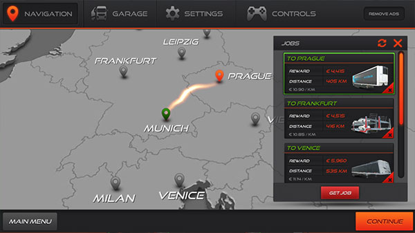 3、控制卡车前进道指定绿色区域领取任务,每个任务地点和货物不同,点击选择合适自己的任务,然后按“GET JOB”按钮。