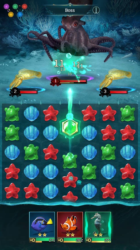 5、守关野生生物的血量条左侧会显示反击回合数,利用这个信息,你可以在敌人还未反击时进行有效的棋子消除。在空闲时间内多消除棋子,能够为你的海灵积攒双倍怒气,为接下来的攻击做好准备。