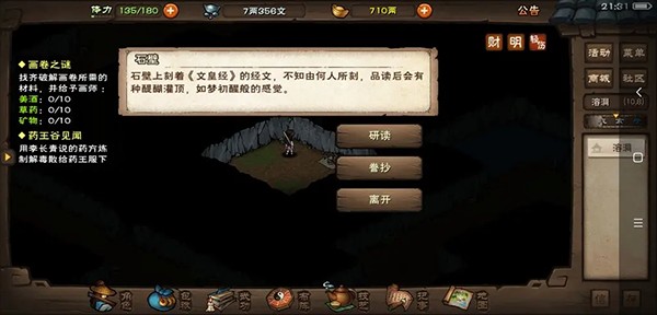4、可以在山洞里读文皇经,也可以选择用20个文房四宝抄录完带走慢慢读。(建议抄写,幽州书店江湖杂书任务三物品)