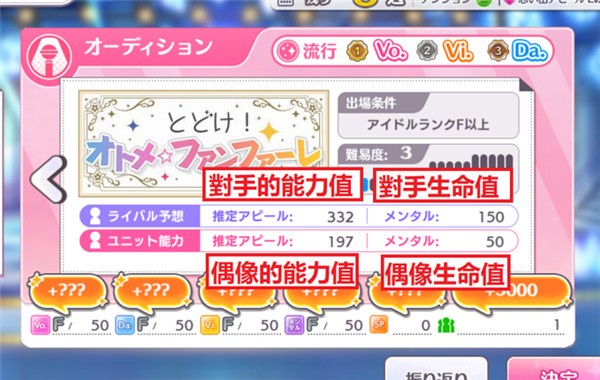 在选择参与那个试镜的画面,会看到对方及自己的不同能力值。如果发现对方能力值或生命值远高于自己,你可能就应该去培育一下偶像或选择更低难度的试镜了。