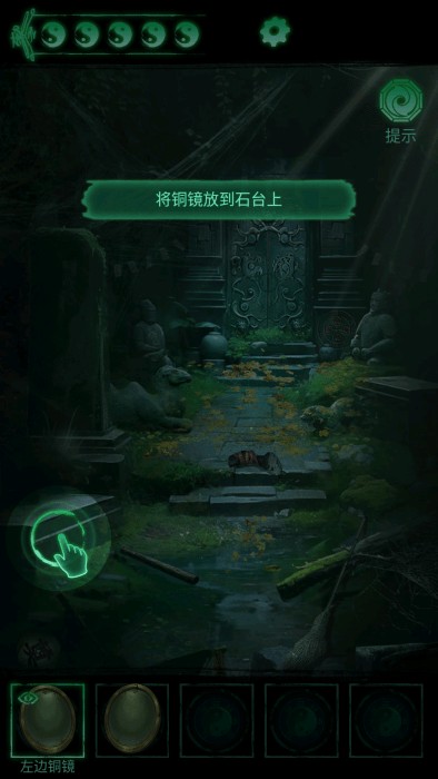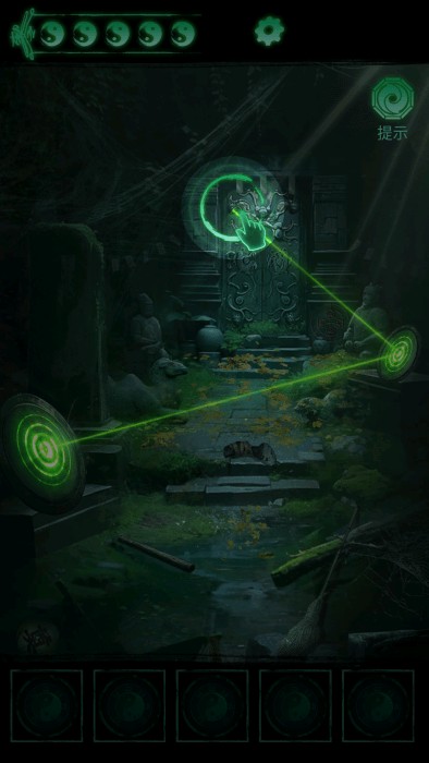 玩家需通过点击、拖拽、组合物品等方式与场景互动,收集线索并解开谜题。例如,用扫帚清理石碑青苔获取数字密码,或调整铜镜角度折射光线激活机关。