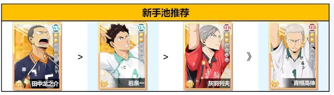 在这里推荐的新手抽取优先级为:田中龙之介 > 岩泉一 > 灰羽列夫 》 青根高伸。