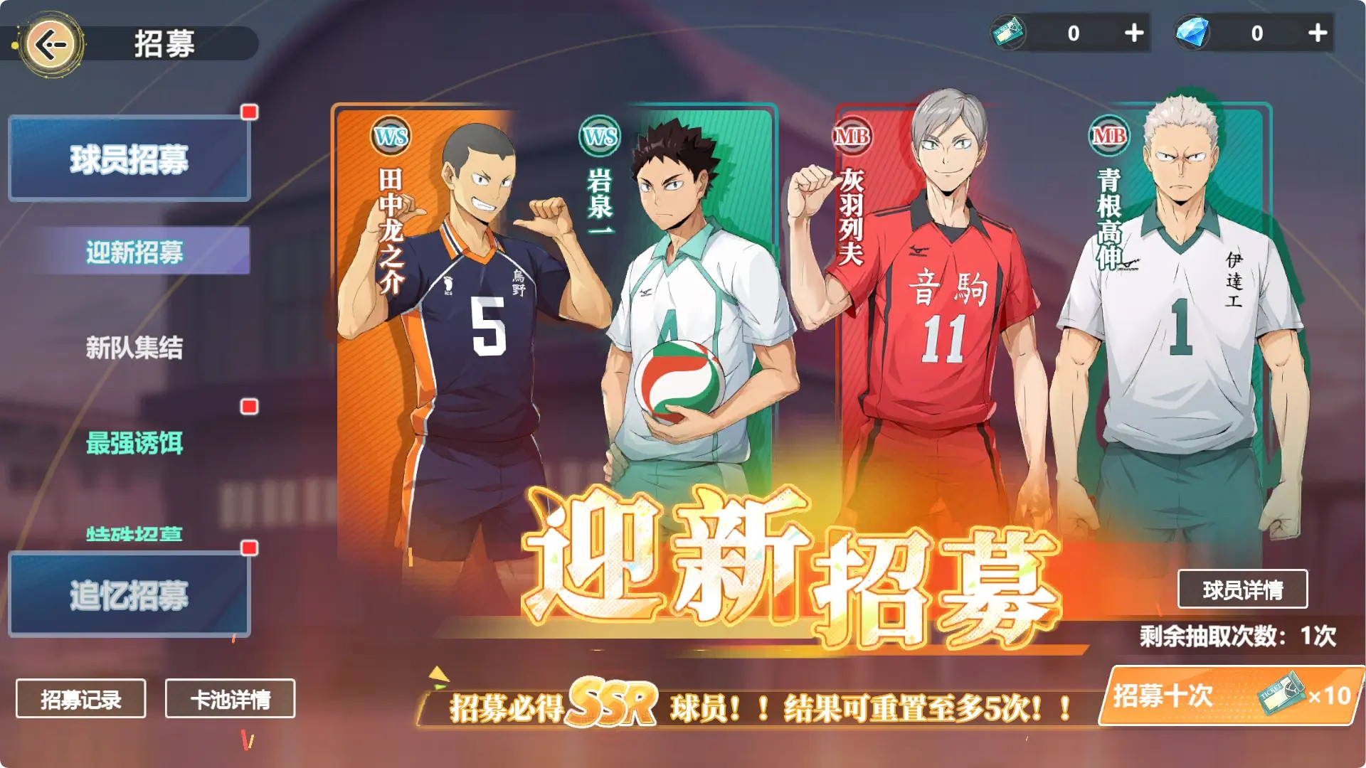 首先,在新手池中,玩家有机会从「田中龙之介」、「岩泉一」、「灰羽列夫」、「青根高伸」中随机抽取到一名SSR角色。官方提供了5次重置抽卡结果的机会,在抽取期间无法保存阵容,玩家需要慎重考虑。