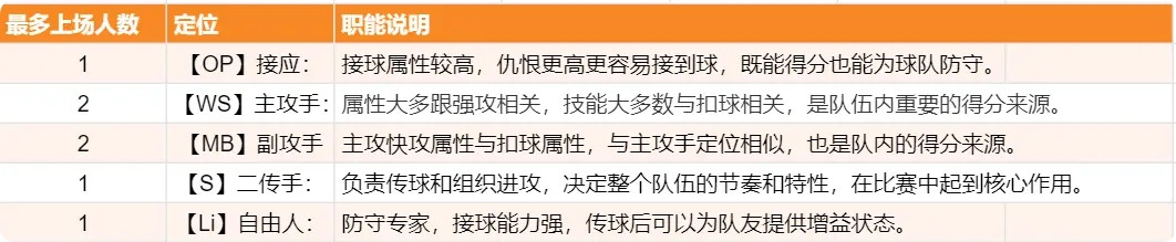 游戏内共有四种属性:【快攻】、【拦网】、【强攻】、【接球】。