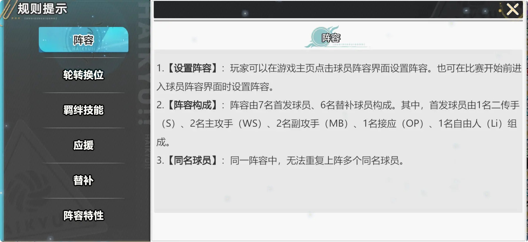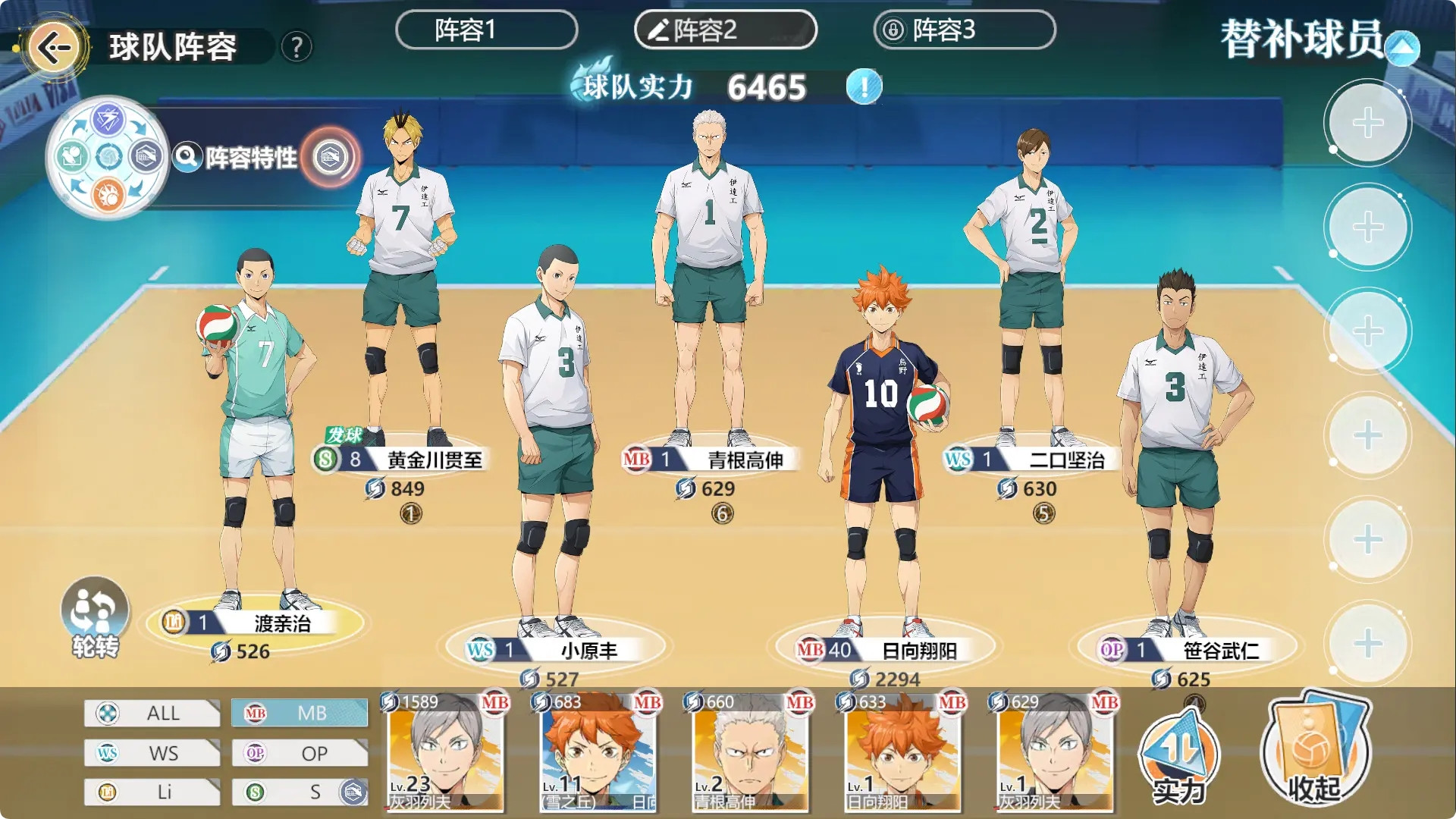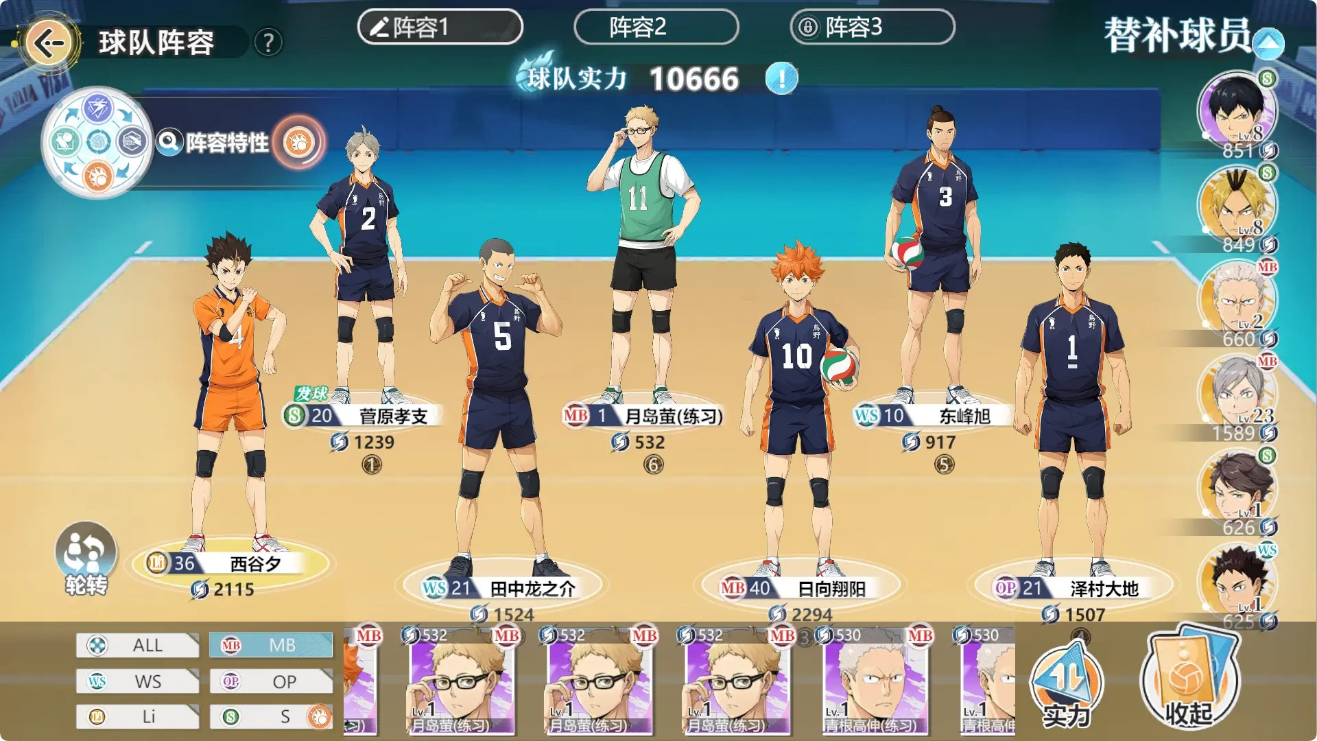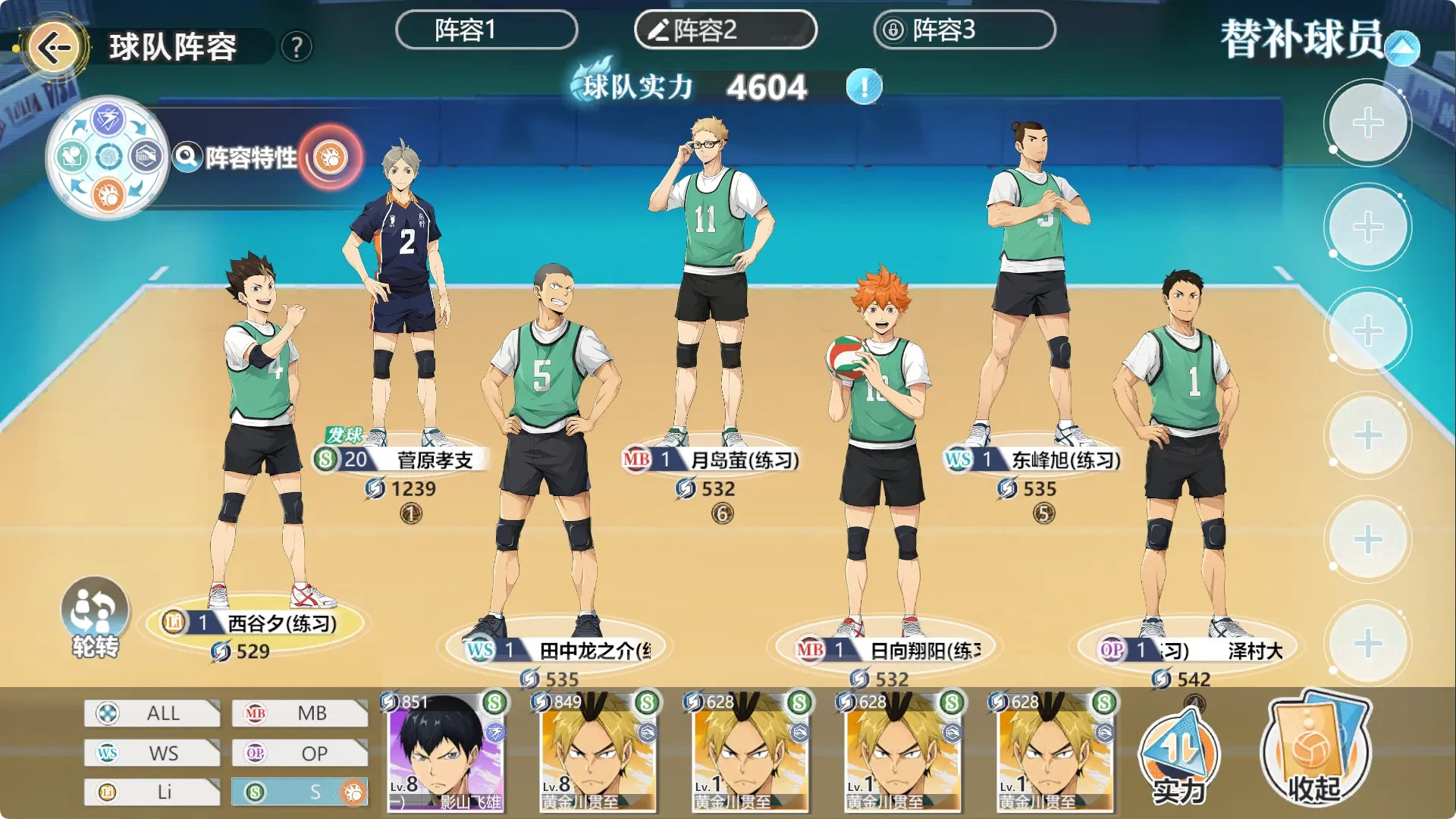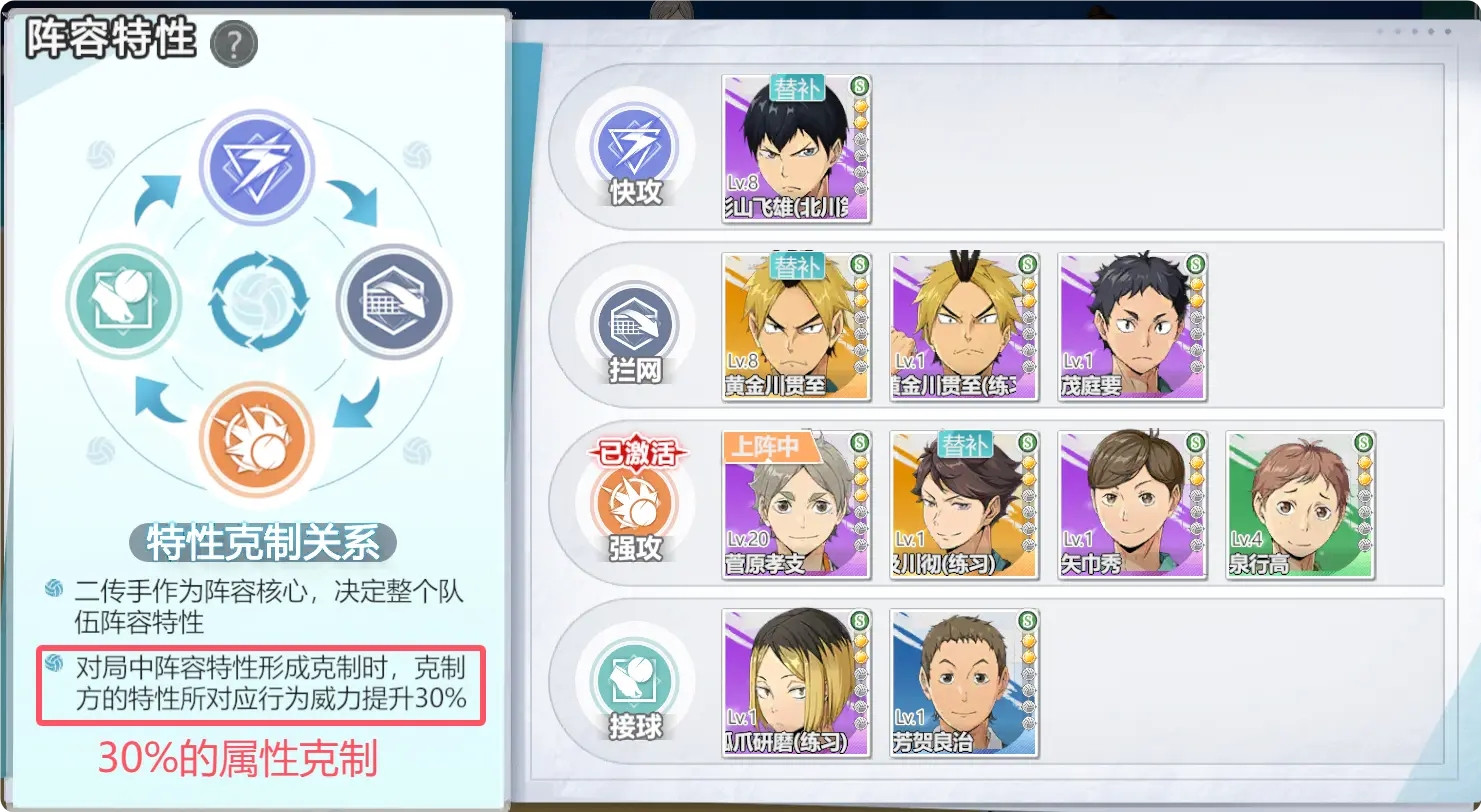 乌野队在很大程度上是游戏内最标配的阵容了,如果二传手「菅原孝支」被克制,玩家们可以将他替换成「影山飞雄(北川第一)」作为替补。