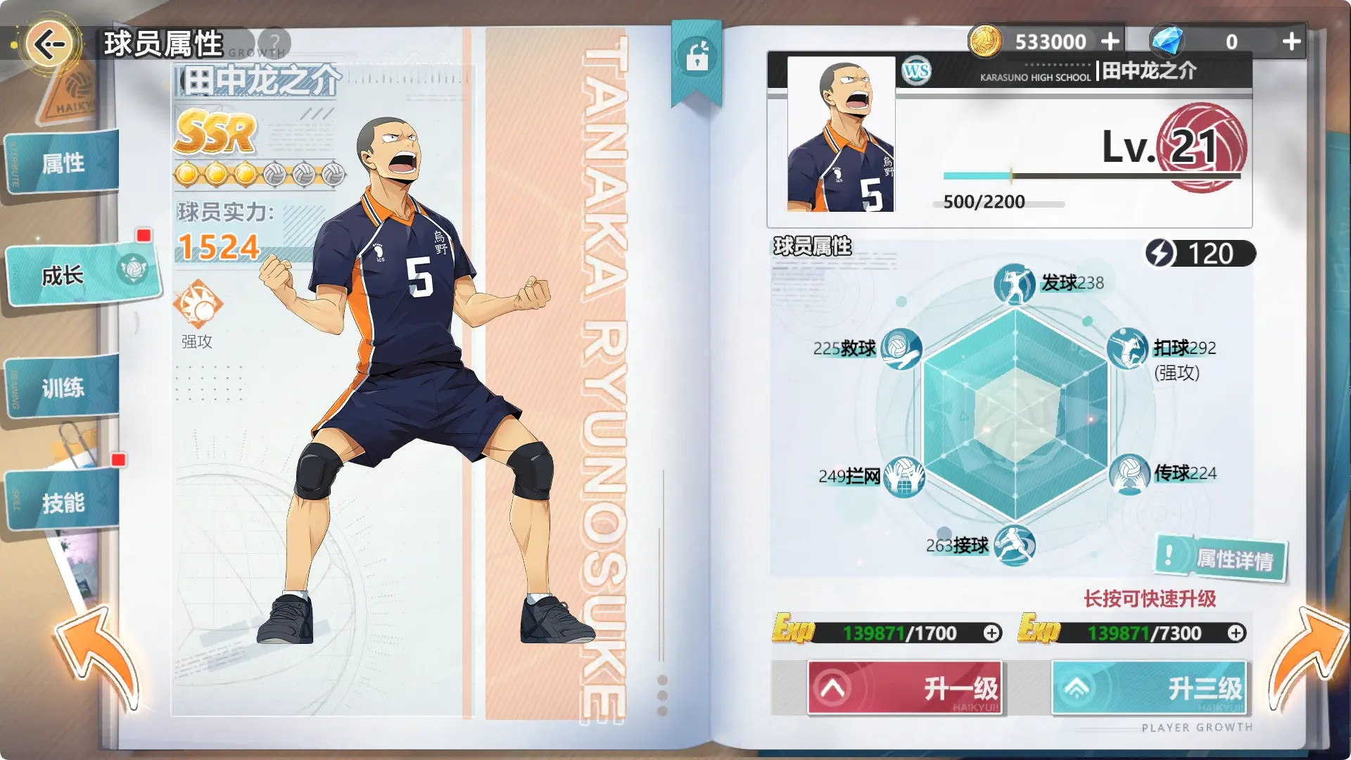 2、其次是技能提升,除开N级角色外,其他的球员在获取时解锁的基础技能仅有三个,而当完成角色相应的训练时,则可解锁角色的新技能。