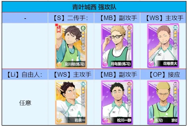 在「青叶城西队」中,核心角色「及川彻」和「岩泉一」的配合能够发挥出极高的效果,特别适合平民玩家。这支队伍依靠「及川彻」的强攻属性二传手特性,不断增幅主攻手「岩泉一」的暴击能力和输出伤害。