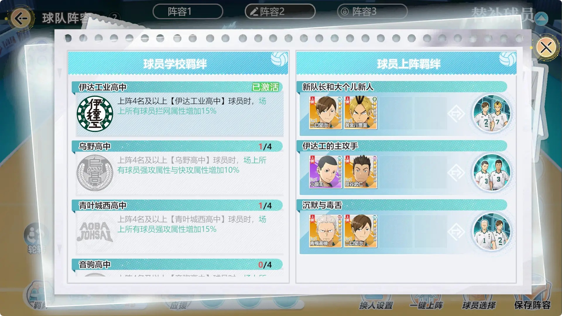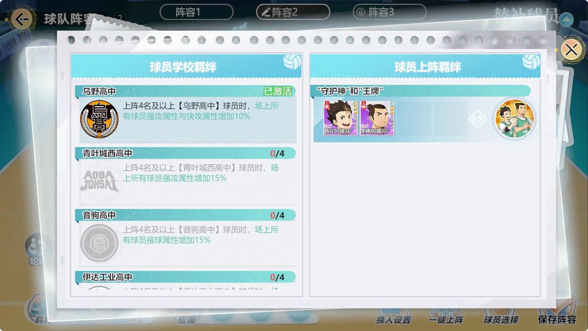 该队伍的成员大部分来自于乌野高中,可以触发四种强力羁绊,带来可观的团队增幅。