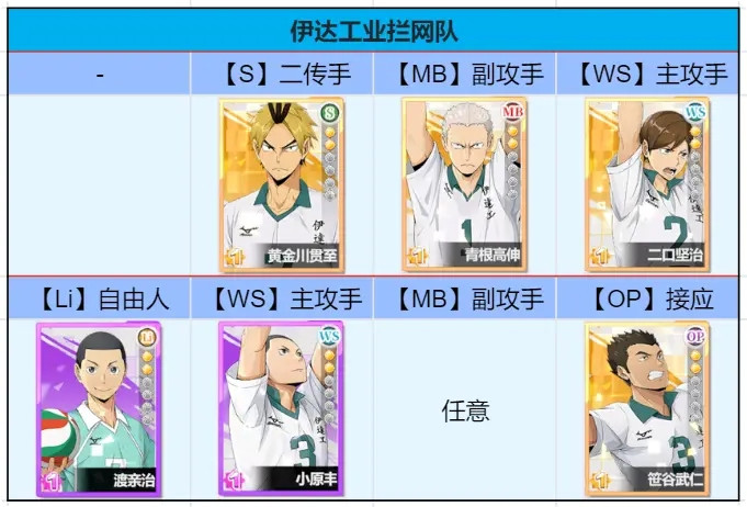 伊达工业高中是一个注重与拦网的队伍,而拦网说白了就是阵容的防御能力, 队伍的所以成员均可以提升拦网的属性值,在拦网成功的情况下,还可以降低对方的输出。在PVP中有着不错的表现。