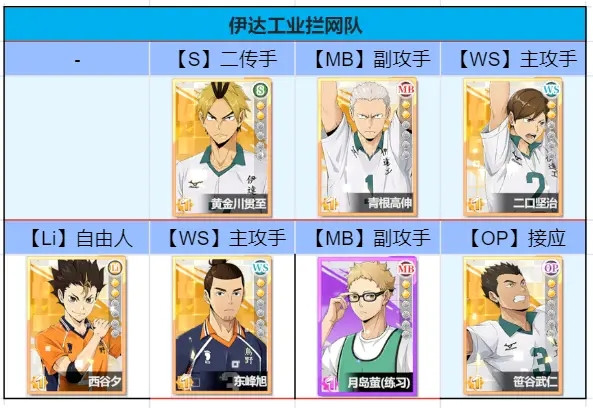 利用高共鸣的西谷夕以及东峰旭补强阵容的输出能力,组成一只混搭队伍,具体阵容可以参考这张图。