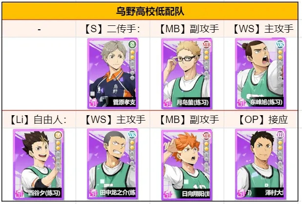 乌野低配队是一套全员SR的组合,主要用于萌新前期过渡,当角色培养到40级后,就可以考虑停手了,后续可以将这些角色转化为晋升狗粮,慢慢培养替换成国家队中的SSR卡。