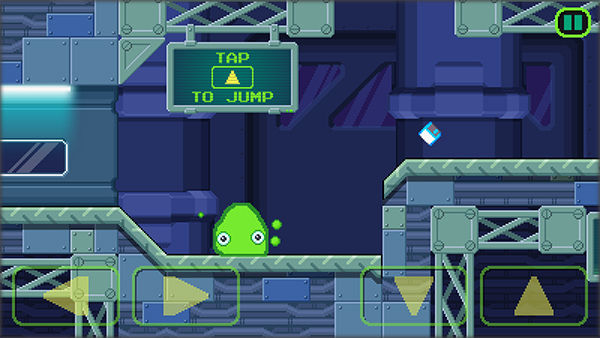 3、当我们的小粘液来到一个高台前的时候,发现上不去了,不过没关系,咱们的小粘液还有一项技能那就是飞檐走壁,说的夸张了点,其实是跳跃功能,游戏中也有提示,有个向上的箭头,下边写着to jump,也就是按方向键上就是跳跃,如图: