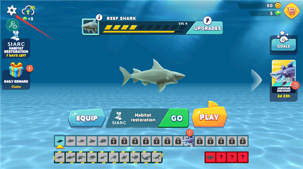 4. 完成50个任务来寻找宝藏,获得金币和宝石来升级你的鲨鱼或购买特殊的救生物品。