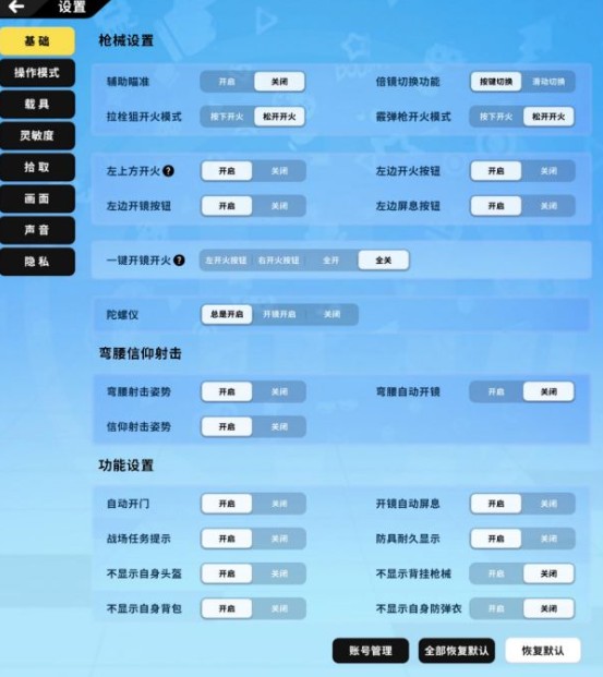 枪械使用习惯设置,陀螺仪开关,弯腰信仰射击细节设置,各类功能性设置开关