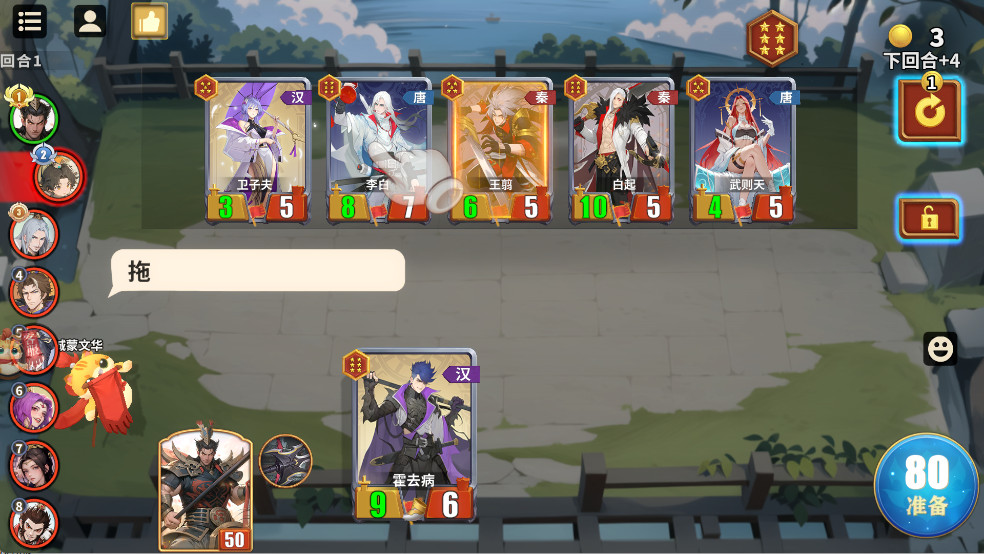 5、回合结束后,继续购买武将,三张相同的卡可以合成金卡;