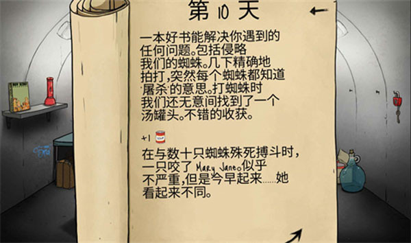 蜘蛛剧情需要玩家在避难所产生空水瓶,前期喝两次水就能够达成。在剧情触发的时候,选择用书本去打蜘蛛,第二天女儿就会变异。不要选择杀虫剂,这样不仅会消耗杀虫剂,而且女儿也不会变异。