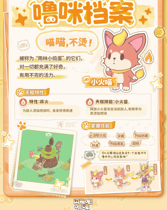 小火喵 火系 高热火焰附带灼烧,输出强力,克制草系,适合快速清怪和捕捉草系噜咪。