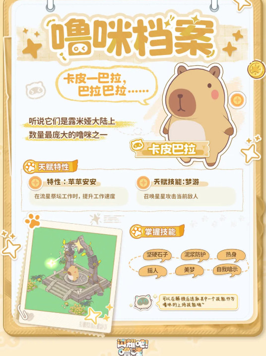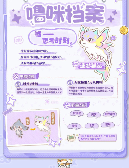 通过喂养互动战斗提升噜咪等级与亲密度,解锁专属技能与成长路径。