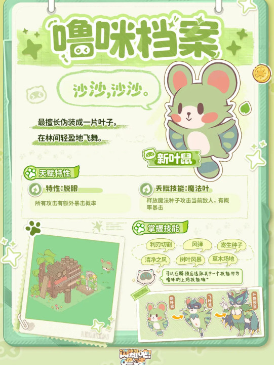 新叶鼠 草系 叶刃切割与控场技能,克制水系,适合控制战场和捕捉水系噜咪。