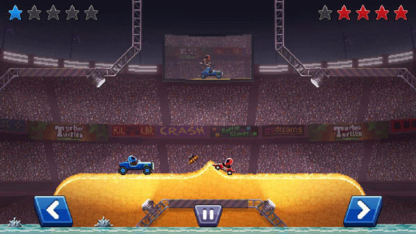 双人撞头赛车的操作都是通过前后两个按钮控制的,只需要点击前进或者后退即可控制小车了~但是千万要小心,这里的车加速过猛是会翻车的,并不是简单的前进后退哦~