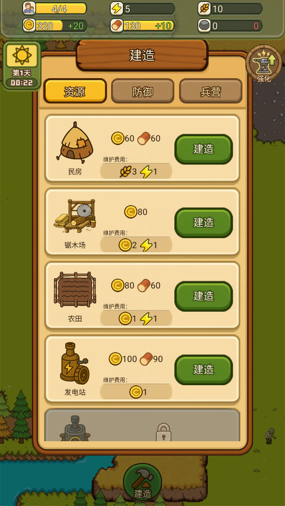 1、在幸存者村庄2白天阶段,点击建造,可以建造各种建筑,增强村庄的防御体系;