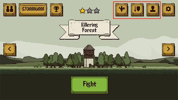 2、点击中间“Fight”即可开始游戏,上方从左到右依次为训练场、武器、人物。