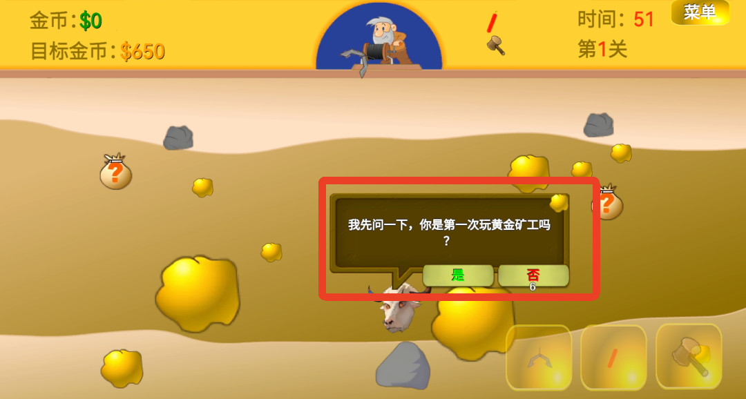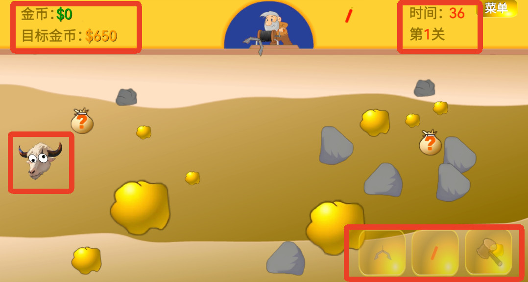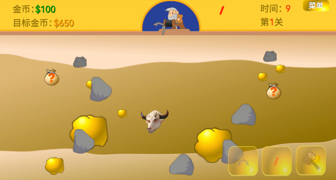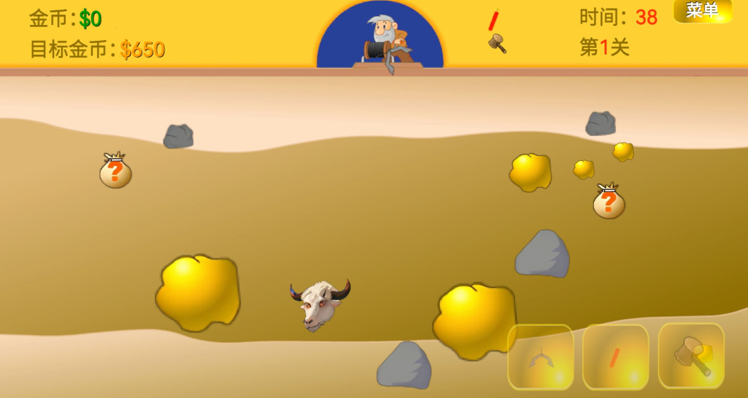 3、之后你就正常抓金矿,点击右下角可以放钩子、丢炸药和扔锤子,扔锤子可以把牛头砸晕,砸晕后可以放钩子抓它,抓到牛头也会有金币。