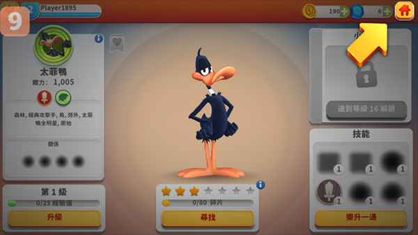 5、达菲鸭:乐一通主要角色,一只烦人的、黑色、黄色鸭嘴的鸭子,喜欢欺负猪小弟,经常败于兔八哥之手,话唠。早期是一个软弱无力的野鸭子,晚期变得很暴躁。讨厌家里有老鼠(所以才会欺负飞飞鼠冈萨雷斯)在影片“太空大灌篮”第52分钟时登上篮球场,结果全场几乎没人为它喝彩。达菲鸭的幽默和搞笑让他在游戏中成为玩家的开心果,他的特殊技能可以帮助玩家在游戏中获得更多的乐趣。