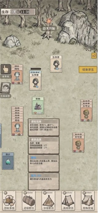 【关于天数与时间】限时生存模式中,白天时间为12分钟,夜晚时间不限时间,白天时,可以进行采集,收容,制作等,夜晚时,所有时间进度将会暂停,进入防守战斗状态,并屏蔽掉除诡异卡外的其他卡牌。生存天数共计50天,每10天会刷新一个BOSS级别诡异入侵,挑战胜利后可获得大量资源,其余非特殊日期的夜晚,击败入侵怪物有概率获得稀有材料和装备。