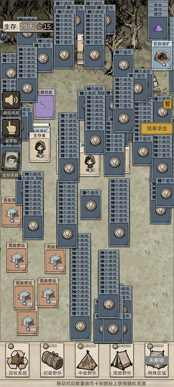 【关于资源采集和野外探索】生存者可以从诡矿中采集诡币,用于下方野外区域的资源随机获取,前期推荐将诡矿升级到中级进行采集,每个级别的野外区域会获得对应级别的祭坛,祭坛收容诡异概率为100%。