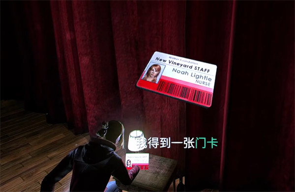 4、在旁边的桌子上,获得门卡,打开门出去。