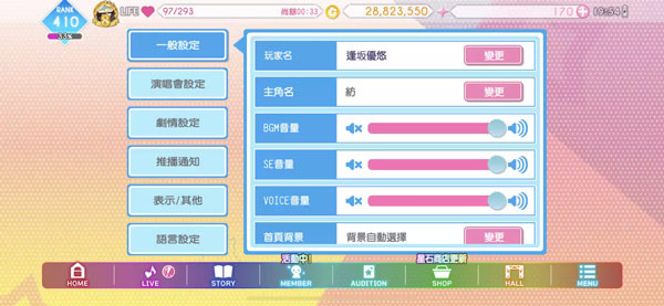 队员组成栏右上角,我们可以看到一个齿轮状的图标,点击它,我们可以设置诸如音量,打歌速度之类的事项。