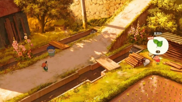 老奶奶最初会因排水阻挡去路,需等待黄昏时她离开,她的田里面有个闪光点就是紫苏叶。